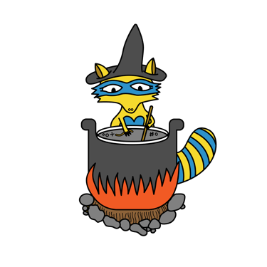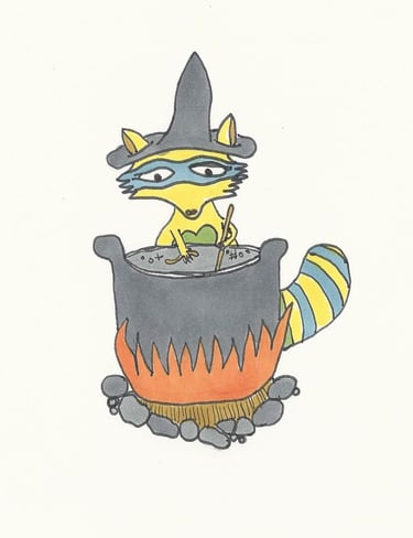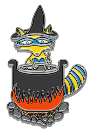 She is no ordinary raccoon; she is the Witch of Mischief, a mythical, colorful raccoon captured here in enamel pin form. While her true name is not known, she is known for her cunning schemes, spells, and potions. She's seen here carefully crafting a very complicated teleportation brew. But why is she portrayed in this pin in the middle of crafting this special elixir? To bring Maddy back to Earth, of course!